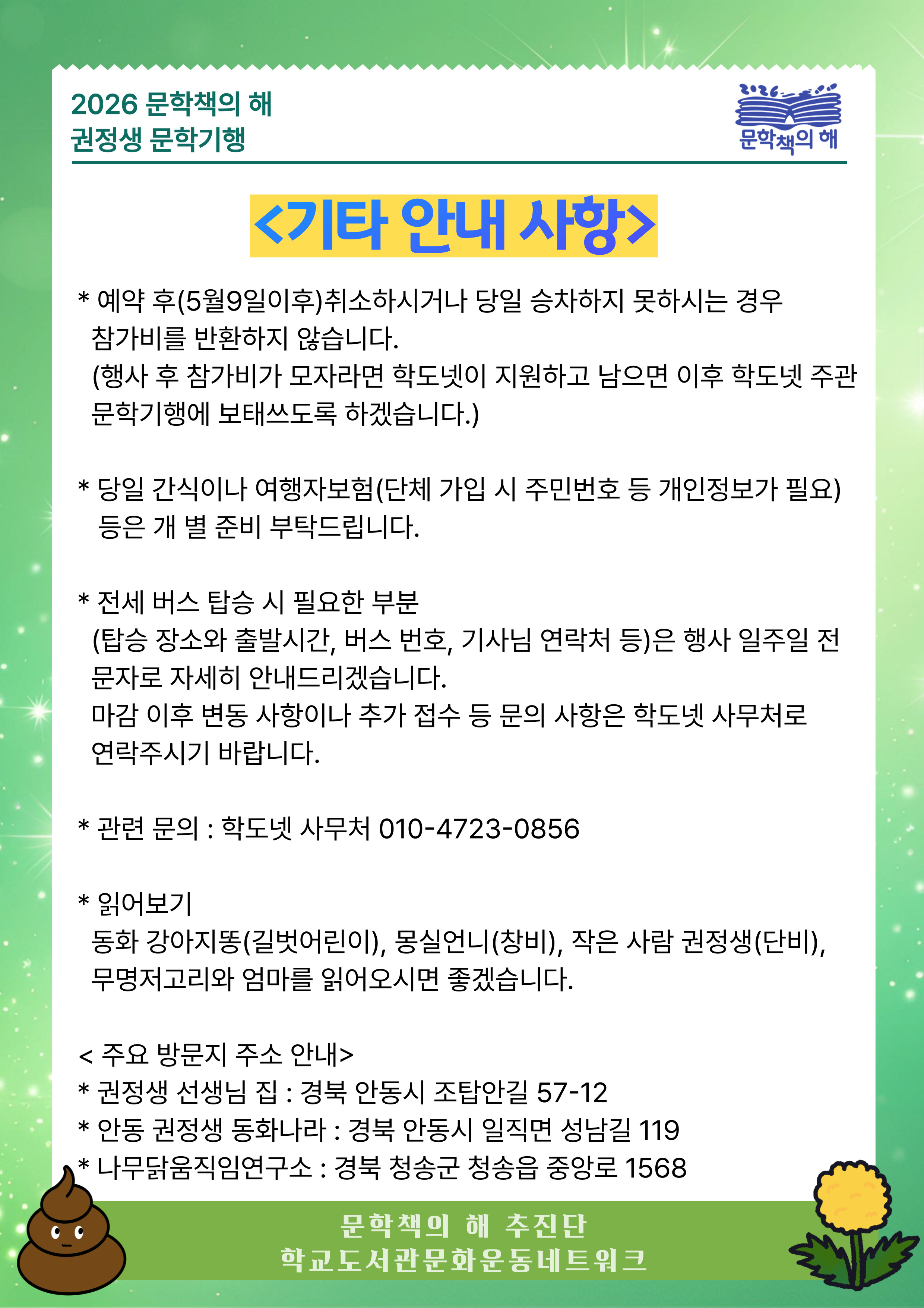 (행사 후 참가비가 모자라면 학도넷이 지원하고 남으면 이후 학도넷 주관 문학기행에 보태쓰도록 하겠습니다.)