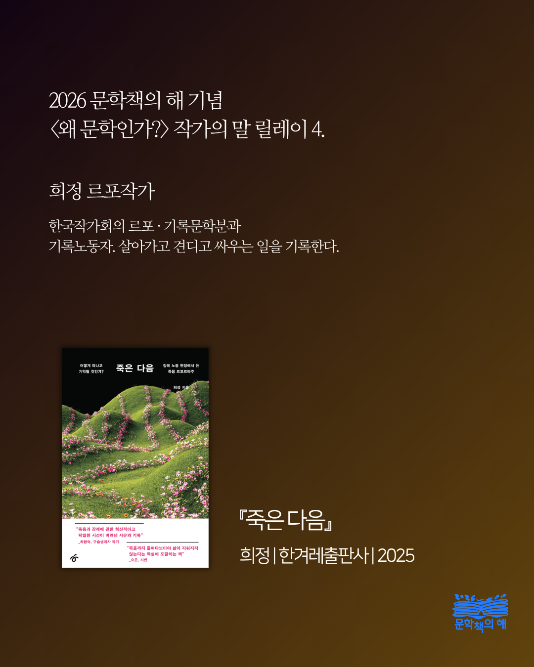 ‘2026 문학책의 해’를 맞아 시작하는 새로운 프로젝트! <왜 문학인가? : 작가의 말 릴레이> 네 번째 이야기를 전해드립니다. 매주 목요일, 우리 시대 작가들이 각자의 시선으로 바라본 문학의 가치와 의미를 책의 해 인스타그램에서 만나보세요😄