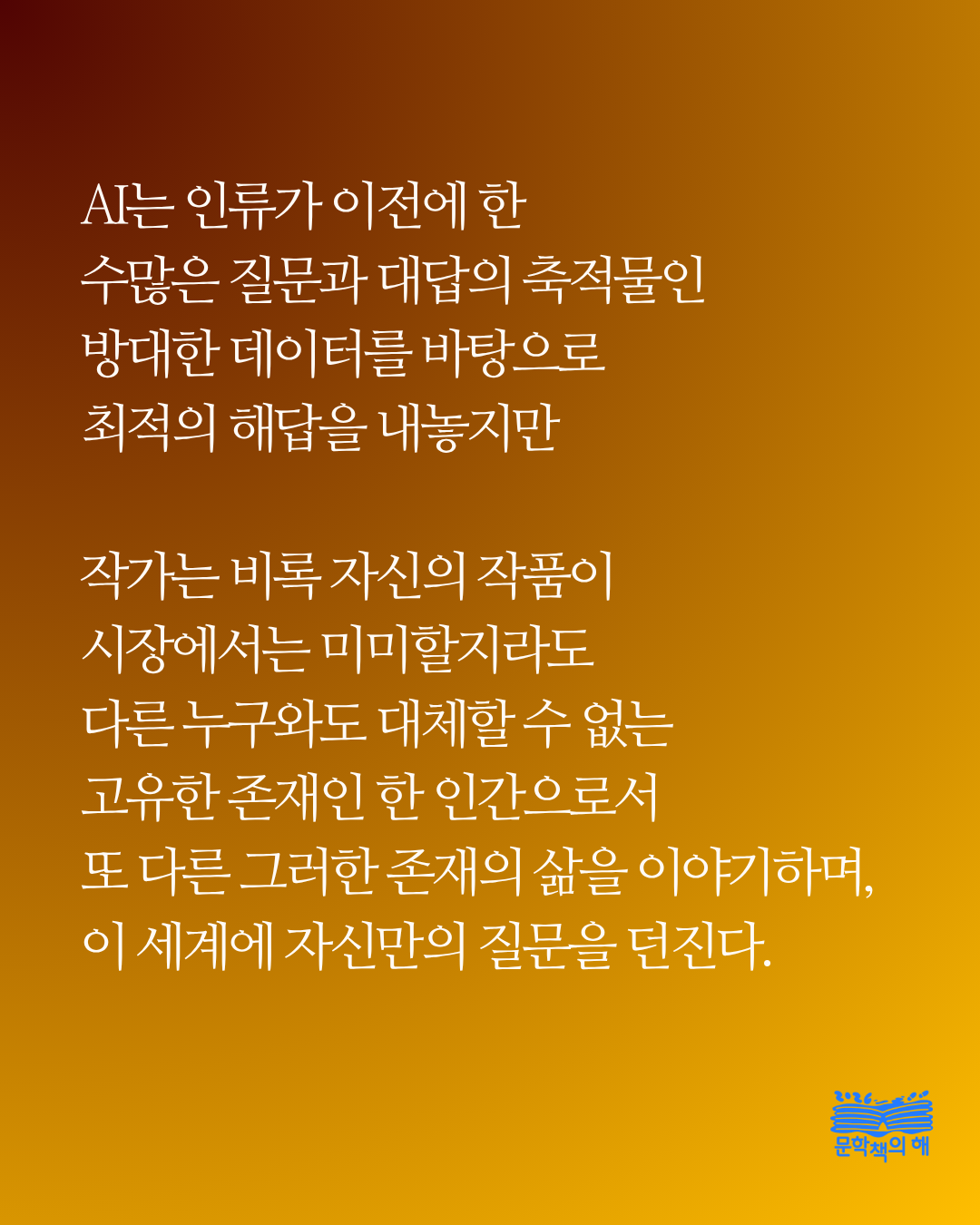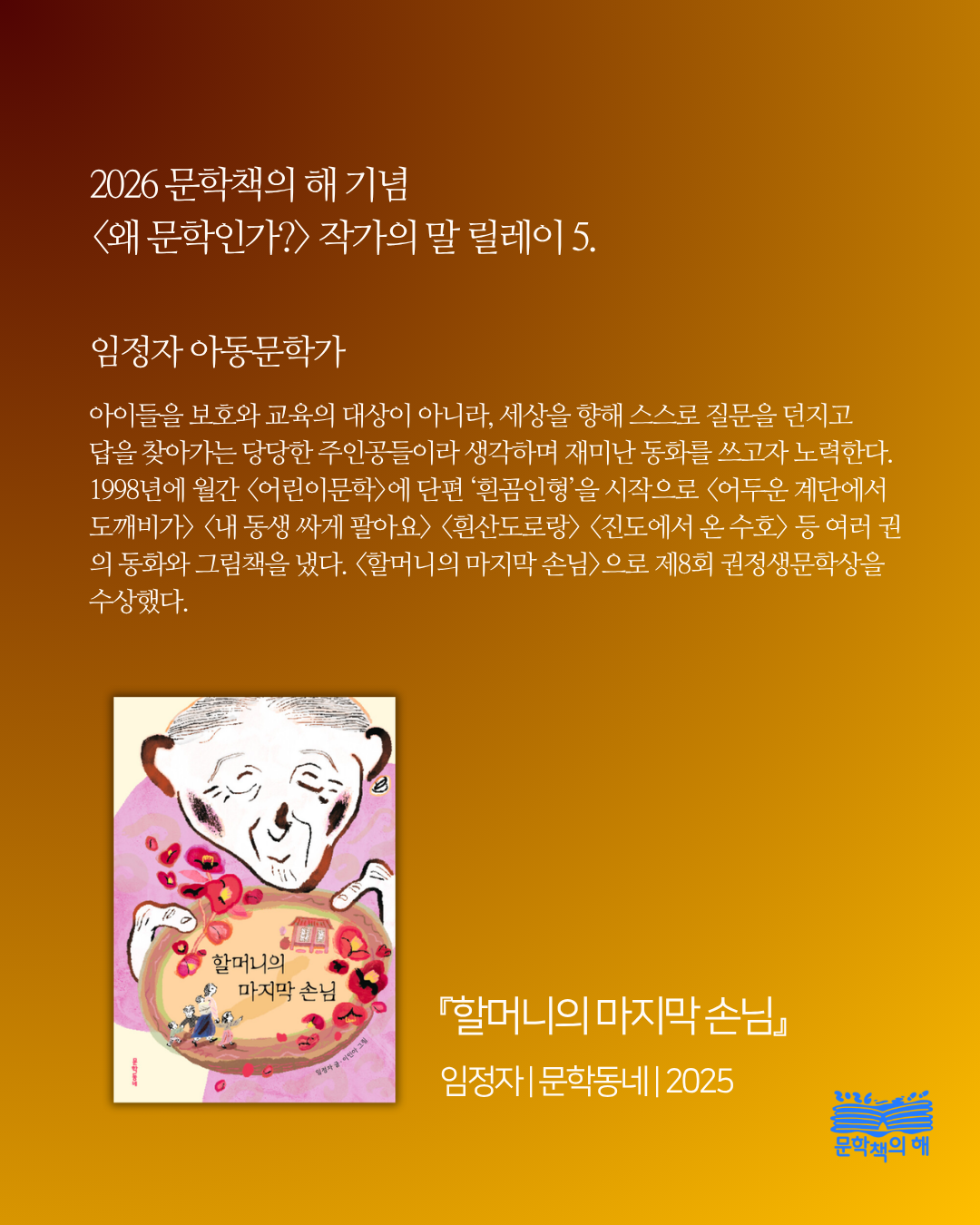 ‘2026 문학책의 해’를 맞아 시작하는 새로운 프로젝트! <왜 문학인가? : 작가의 말 릴레이> 다섯 번째 이야기를 전해드립니다. 매주 목요일, 우리 시대 작가들이 각자의 시선으로 바라본 문학의 가치와 의미를 책의 해 인스타그램에서 만나보세요😄